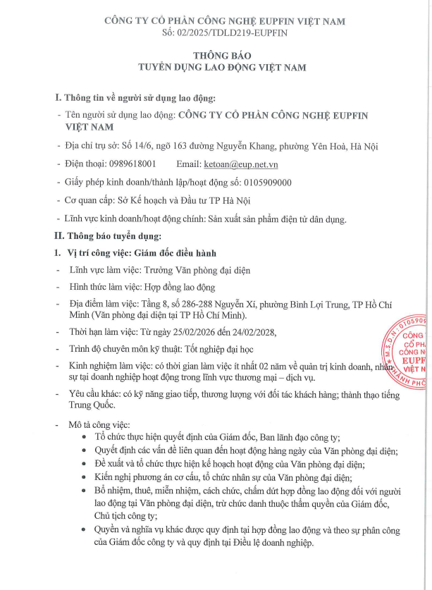 - Tên người sử dụng lao động: CÔNG TY CỔ PHẦN CÔNG NGHỆ EUPFIN VIỆT NAM