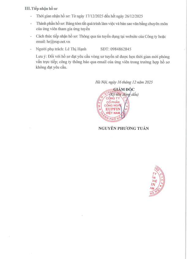 • Cách thức tiếp nhận hồ sơ: Thông qua tin tuyển dụng tại website của Công ty hoặc email: hr@eup.net.vn